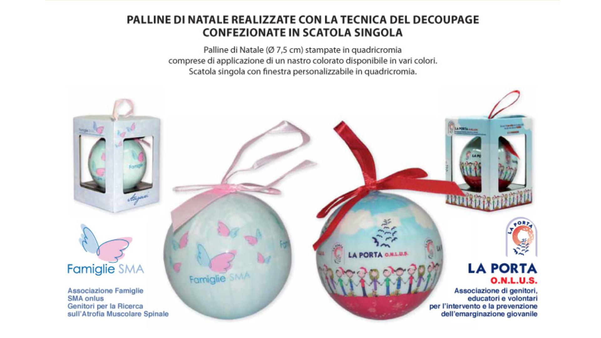 Il meccanismo è piuttosto semplice: l’organizzazione acquista gadget ad un costo conveniente e facendo leva su un evento periodico (Natale, Pasqua, festa della mamma, del papà, della donna, matrimonio, battesimo, cresima e comunione) li rivende ad un prezzo maggiorato così da creare un guadagno da destinare a fondo. Prodotto unico nel suo genere, con grande potenziale di comunicazione e fidelizzazione del donatore. Le palline natalizie sono infrangibili, hanno un diametro da mm 75 e sono personalizzabili su tutta la superficie esterna e confezionate con un fiocco in raso con colore in tono con la grafica generale della pallina. Vengono poi inserite singolarmente in un astuccio di cartoncino anch'esso personalizzato. Le palline sono un prodotto molto adatto per la raccolta fondi e realizzando grafiche diverse anno per anno sono lo strumento ideale per rafforzare un rapporto di fidelizzazione con il donatore.