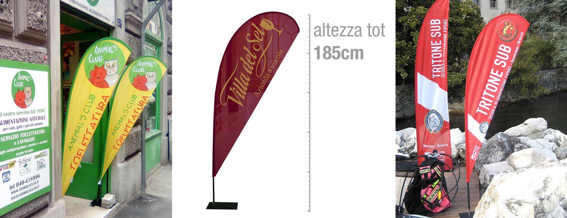 Bandiera pubblicitaria autoportante, personalizzata con stampa intercambiabile sagomata a goccia. Altezza totale 1,9 m.