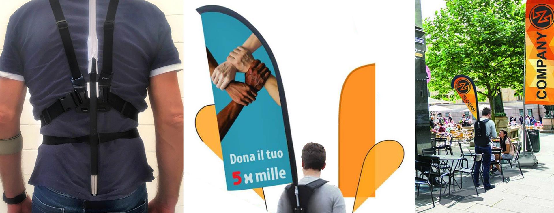 Portabandiera da spalla per campagne informative dinamiche di sicuro impatto visivo, anche nel mondo del non profit.