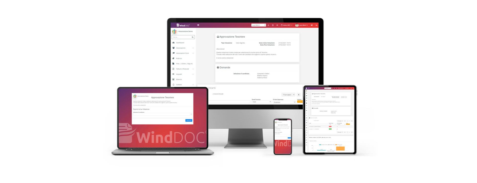 WindDoc No-Profit è un software progettato per facilitare le votazioni nelle associazioni. Consente di creare diverse tipologie di votazioni, come l'approvazione del bilancio, l'adesione di nuovi soci o nuove candidature. Ogni votazione può essere personalizzata e inviata anche a un numero ristretto di soci, i quali riceveranno un'email dedicata per esprimere il proprio voto. Al termine di ogni votazione, il sistema genera un grafico che visualizza i risultati, permettendo di verificare quali soci hanno partecipato e chi si è eventualmente astenuto.